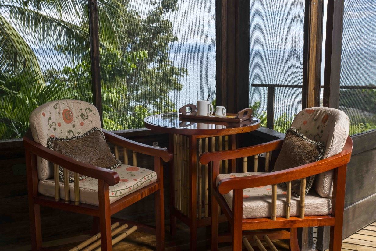Over 350 feet above the sea, fourteen, attractive, palm-thatched bungalows line three ridges, built in harmony with the surrounding forest, coastline and wildlife.