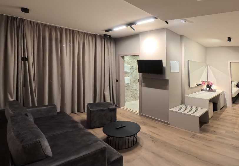 Junior Suites with air conditioning, bathroom with raindrop walk-in shower and hairdryer, telephone, satellite TV, complimentary WiFi, mini bar (empty, stocked on request). Usually with one very spacious double bedroom and a small lounge with a single bed. Sleeps maximum of three persons. The hotel has four suites, two suites with balcony, two suites without balcony. Mainly inland/town/garden view