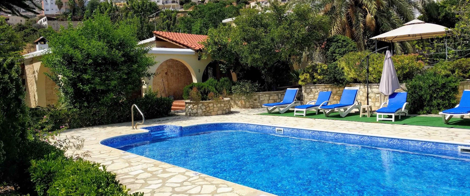 Anna Maria Villa is the extended former family house of sisters Anna and Maria, part of which was built by their grandparents in 1935, and consists of a two bedroom house and a one bedroom annexe. Surrounding the property is an extensive, well-maintained garden planted with fig, olive, lemon, mandora, pomelo almond and carob trees to name but a few. Herbs are everywhere and there is a swimming pool and covered veranda, ideal for al fresco dining. Nearby, you will find some of the original houses of Peyia.