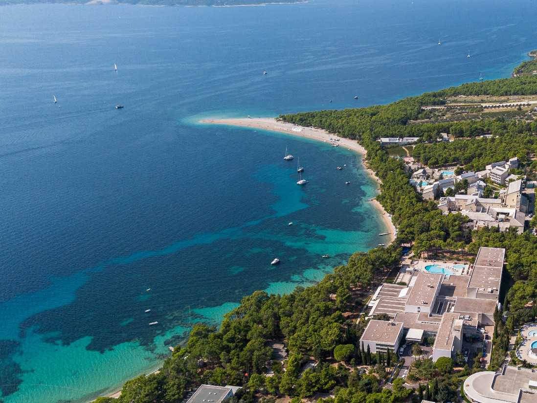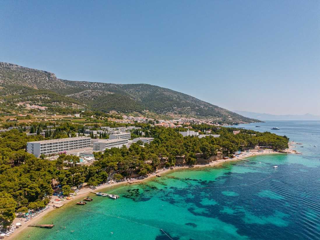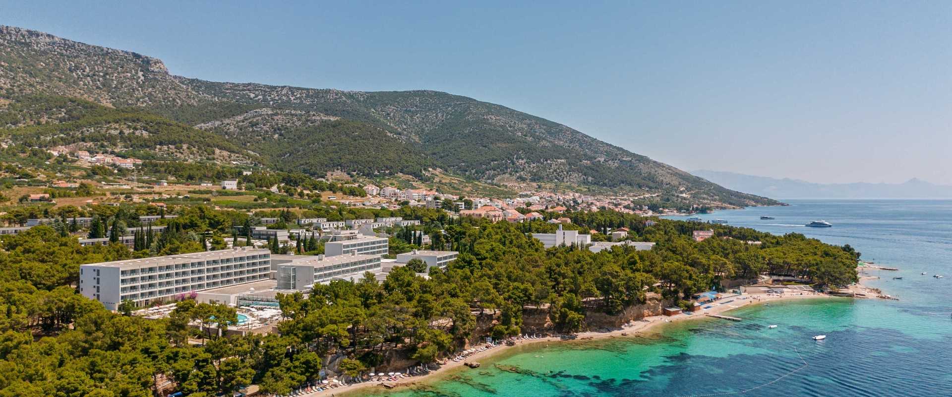 ‘Grand’ is the right word for this 4-star hotel because it is certainly large and, at 307 rooms. The property, set in gardens, has been completely refurbished. It feels modern with light wood Mediterranean decor, fresh, airy and is perfectly situated in the midst of a pinewood that stretches down to the sea. The beach is 50 metres away and the famous Zlatni Rat Beach a 10-minute walk. In the opposite direction the seafront of Bol can be reached in an 800 metre (10 min) walk and, if you are feeling lazy, the little passenger train plies its way from Bol seafront to the hotel entrance.