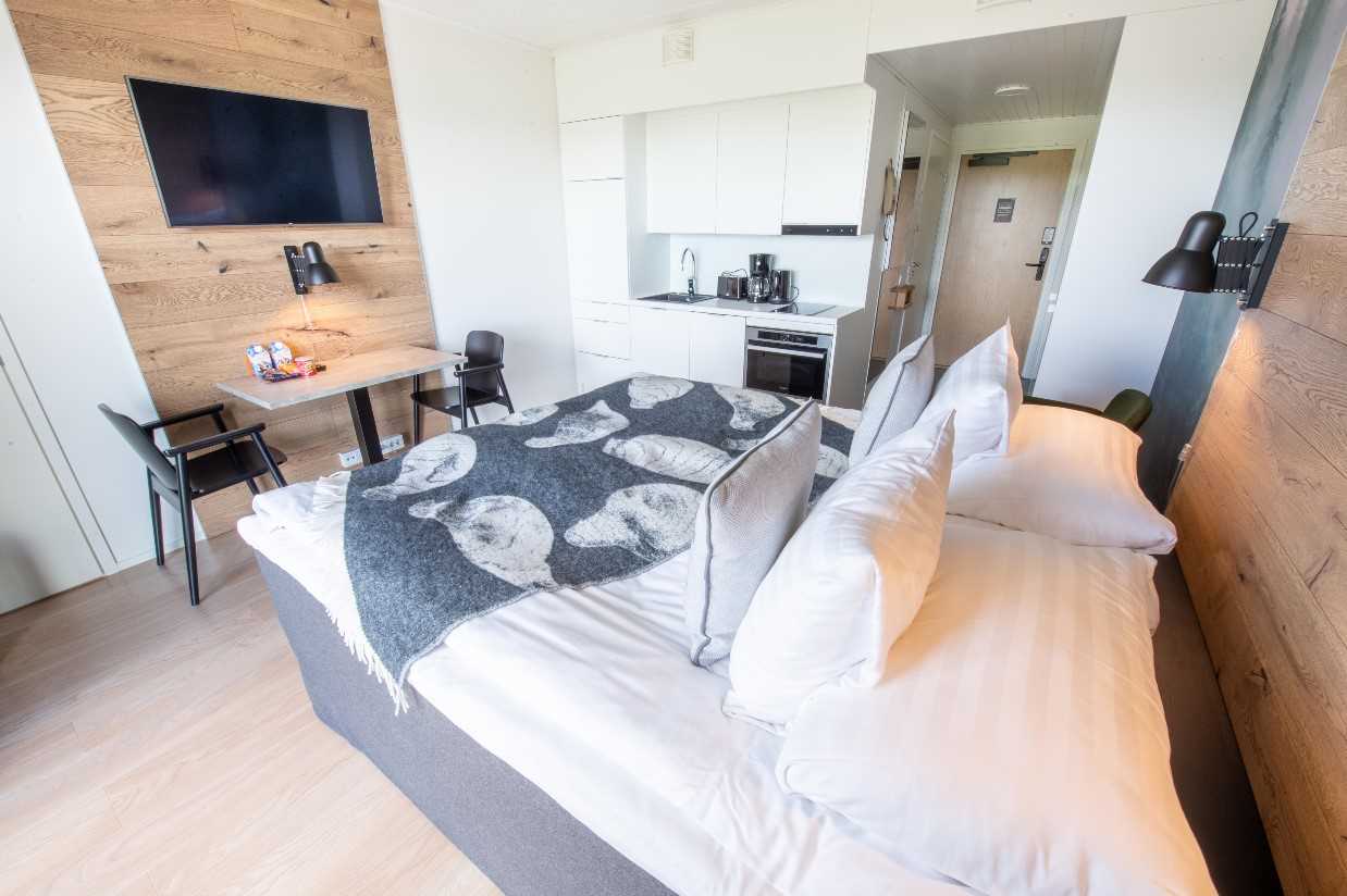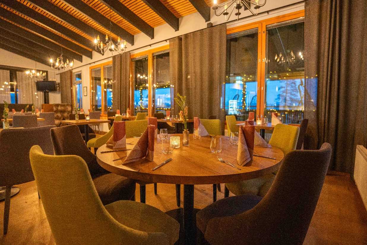 The Kide Hotel has 60 rooms in total and a relaxed, informal atmosphere, with an a la carte restaurant and half board offered as either a buffet or a two-choice set menu, depending on guest numbers. Four glass-roofed suites are located around 500 metres from the hotel, ideal for nights spent watching the northern skies.