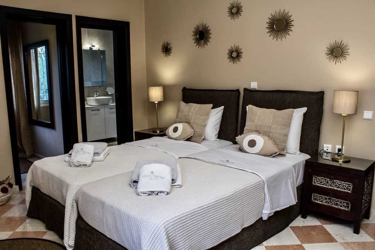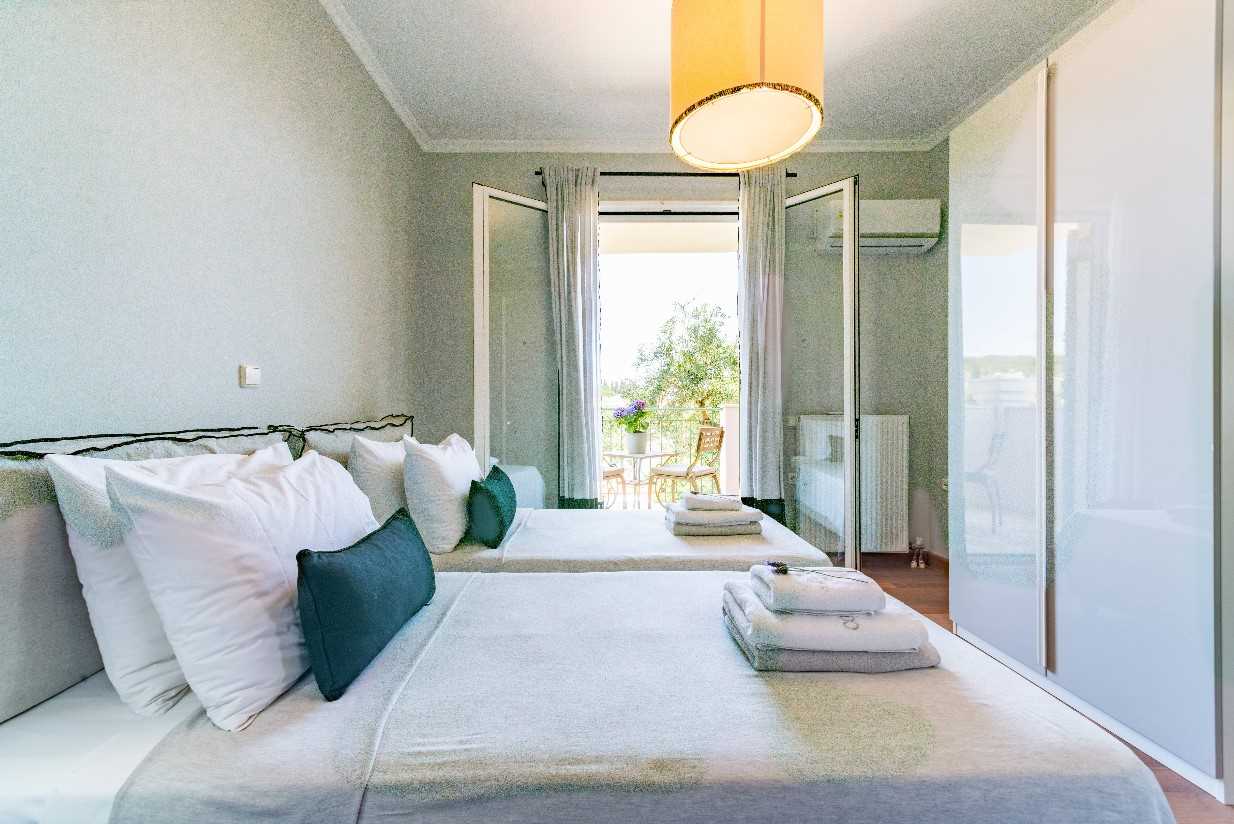 On the northeastern coast of Corfu, the village of Kassiopi enjoys an enviable setting, embraced by the clear turquoise waters of the Ionian Sea and framed by gentle hills and ancient olive groves. At its centre lies a sheltered natural harbour, where traditional fishing boats share the water with modern yachts, and a small collection of tavernas, cafés and shops lend the village its relaxed yet sophisticated atmosphere. Everything is close at hand, allowing days to unfold at an unhurried, effortless pace.