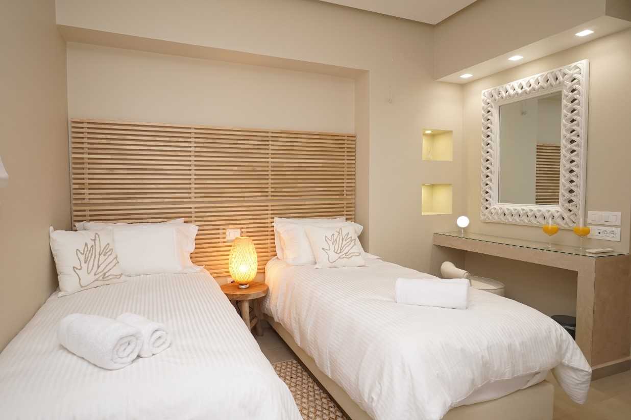 These 100 sqm single storey villas have two sea view/mountain view bedrooms, each with an en suite bathroom. There is a living/dining area and fully equipped kitchen. The barbeque and al-fresco dining areas, plus infinity pools (Roman steps) with sunbeds and umbrellas complete the picture.
