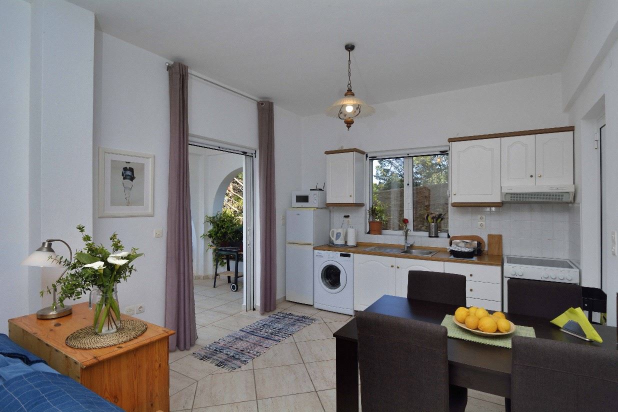 The ground floor has a tiny bedroom (not air conditioned) with a bunk bed suitable for children only. The living room with a sofa bed and a 26” flat screen TV opens, via French windows, on to a covered terrace with superb views. The kitchen area comes with full cooker, toaster, coffee maker, washing machine, fridge/freezer and microwave. All windows and sliding doors are fully mozzie-netted.