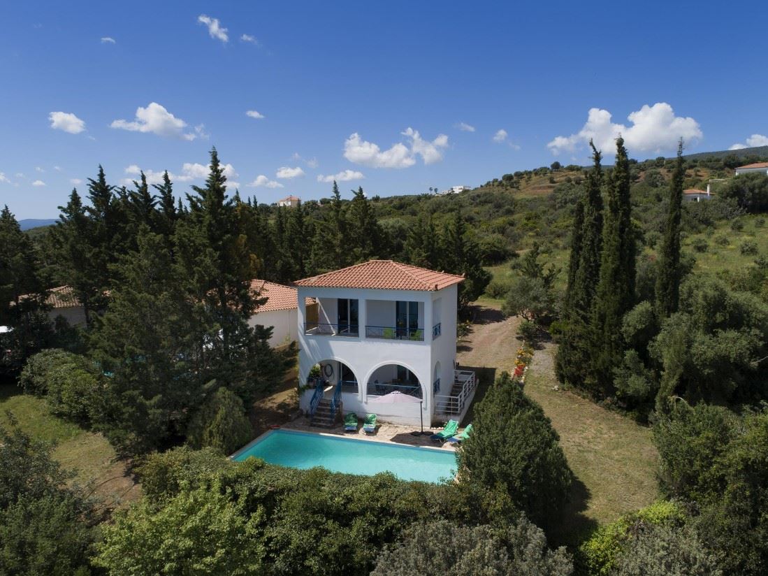 Set to one side of the small private estate, Kalamaki Eleni Villa is on two floors. The views to the sea over the private pool and to the side are spectacular, especially from the top covered terrace.