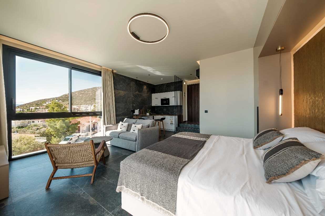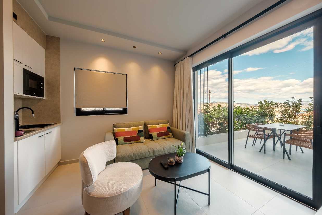 Named Rusty, Gorillas and Vibe (24 sq m). Open plan room comprising king-size bed (can be made up as two singles if desired), small living area with table and chairs, walk-in rainwater shower and a furnished sea view terrace or balcony. Amenities include a well equipped kitchen, Smart TV, WIFi, Air Conditioning, hairdryer. An iron and ironing board can be provided on request.
