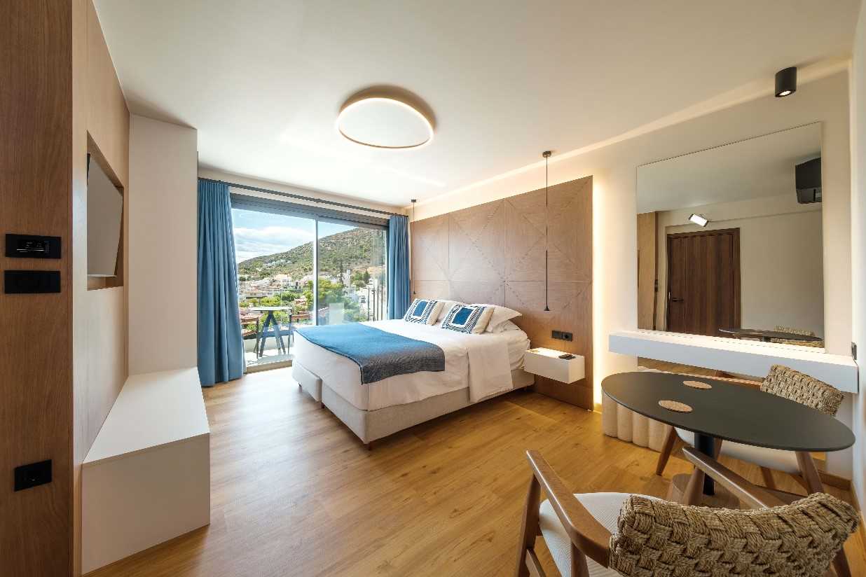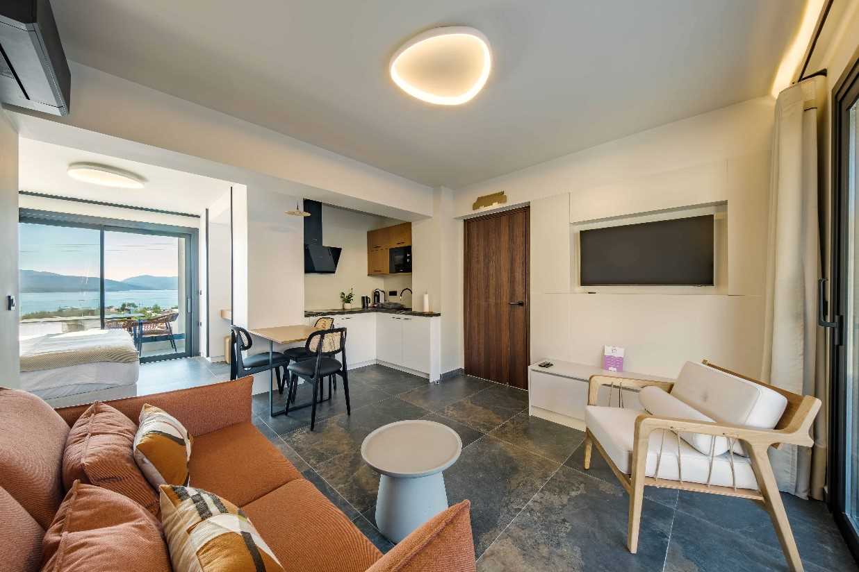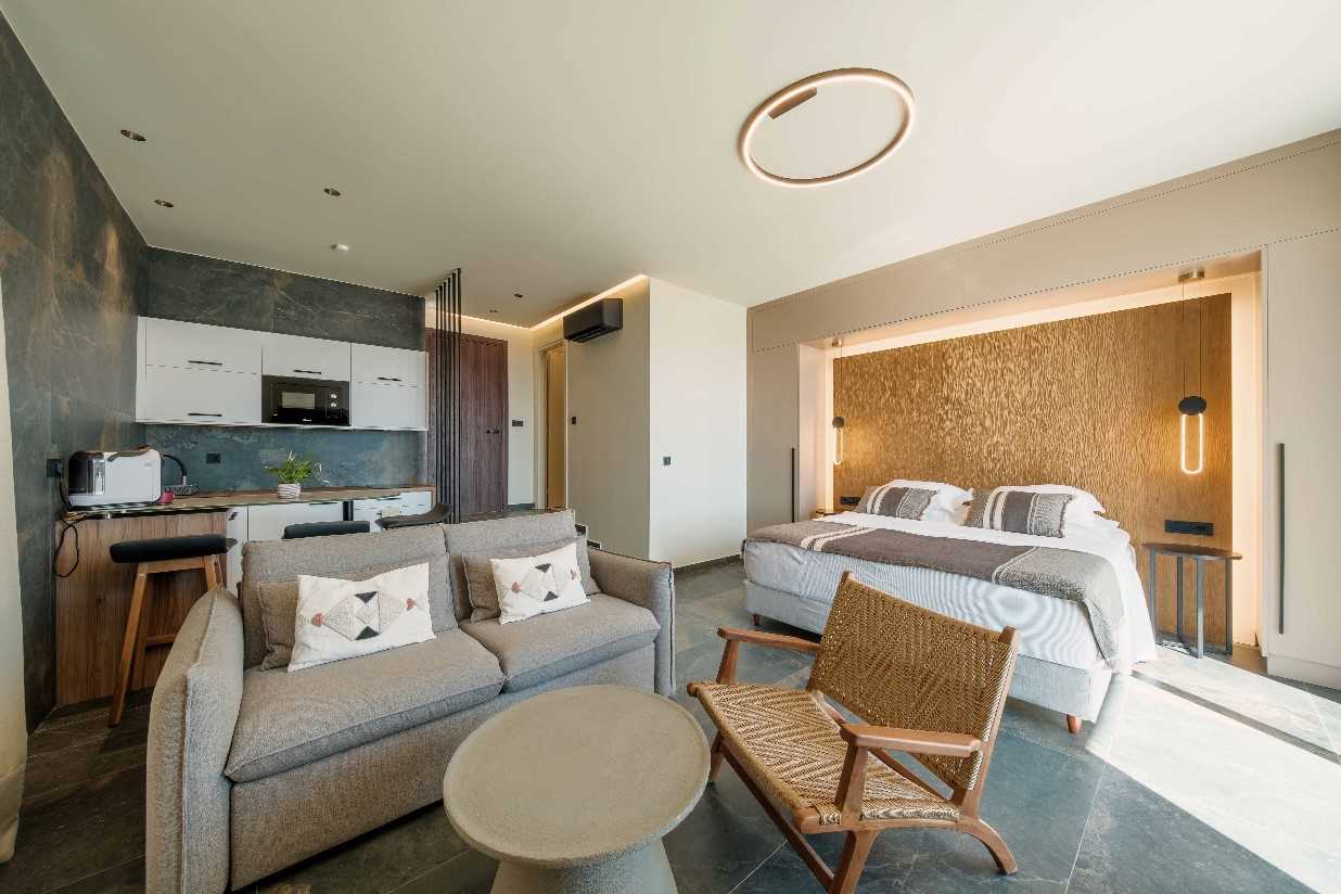 Named Muses, Aquarius, Memory and Angie (33-36 sq m). Open plan comprising king-size bed (can be made up as two singles if desired), living room area with double sofa bed, table and chairs, walk-in rainwater shower and a furnished sea view terrace or balcony. Amenities include a well equipped kitchen, Smart TV, WIFi, Air Conditioning, hairdryer. An iron and ironing board can be provided on request.