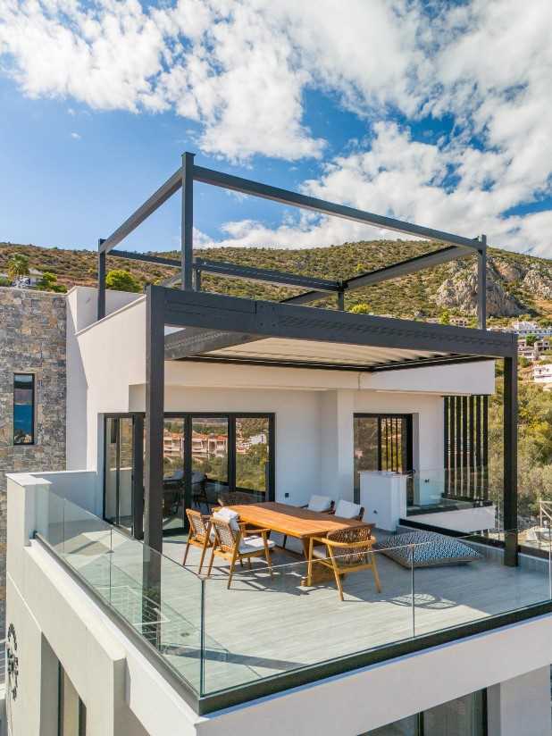 There are eight suite-style apartments here spread over three floors. The Junior Suites measure 24 sq m and are called Rusty, Gorillas and Vibe (names which may ring a bell with anyone who has enjoyed Tolon’s nightlife over the past 40 years) and located to one side, albeit still enjoying fine views. (Please note that Vibe is on two levels with a ground floor kitchen and the bedroom upstairs). The Suites measure 33-35 sq m and directly face the bay. The top floor Penthouse Suite has 2 bedrooms and a fabulous large front terrace graced by a large dining table made from solid Iroko wood.