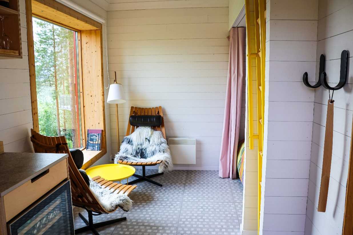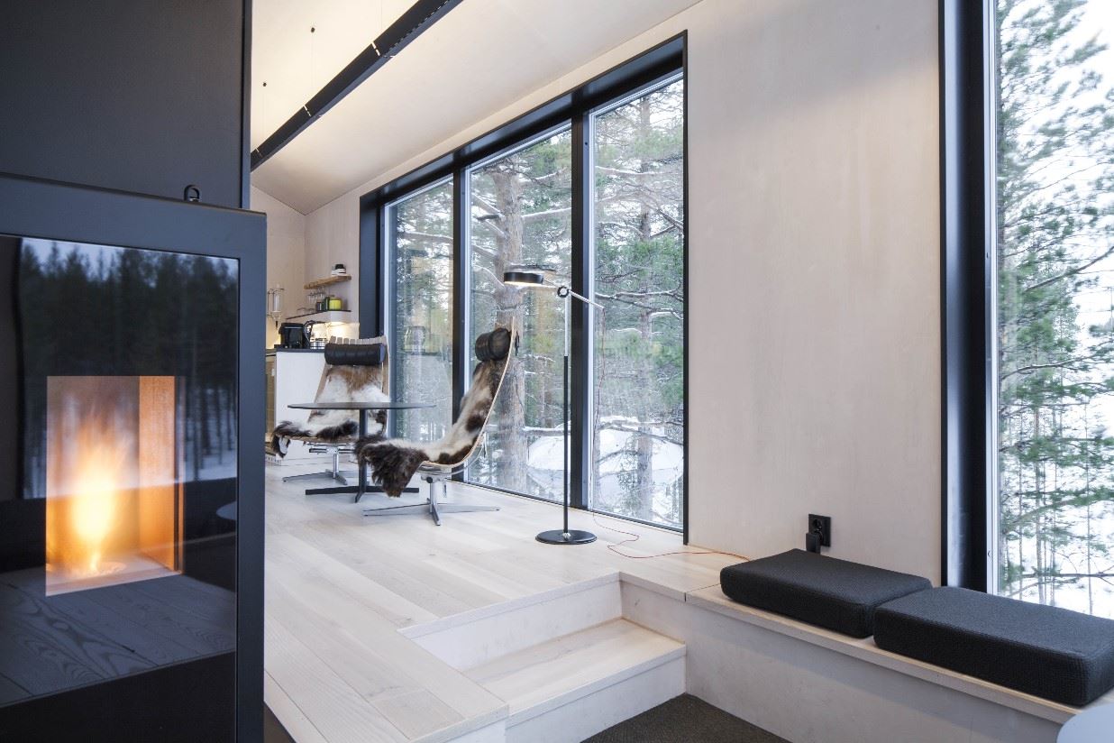 This large suite is positioned high in the treetops, accessed by a metal staircase. There is an elevator for luggage. This spacious cabin (75sqm) has a open-plan living room with fireplace and kitchenette (coffee maker, kettle, wine chiller and fridge), bathroom (shower, incineration WC and washbasin), two twin bedrooms and panoramic views over the Lule river. The room can accommodate five people by using a futon-style bed in the lounge.