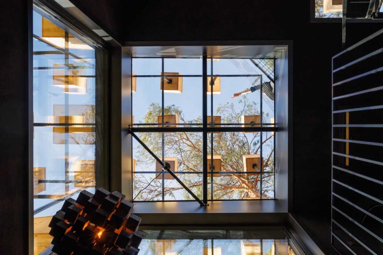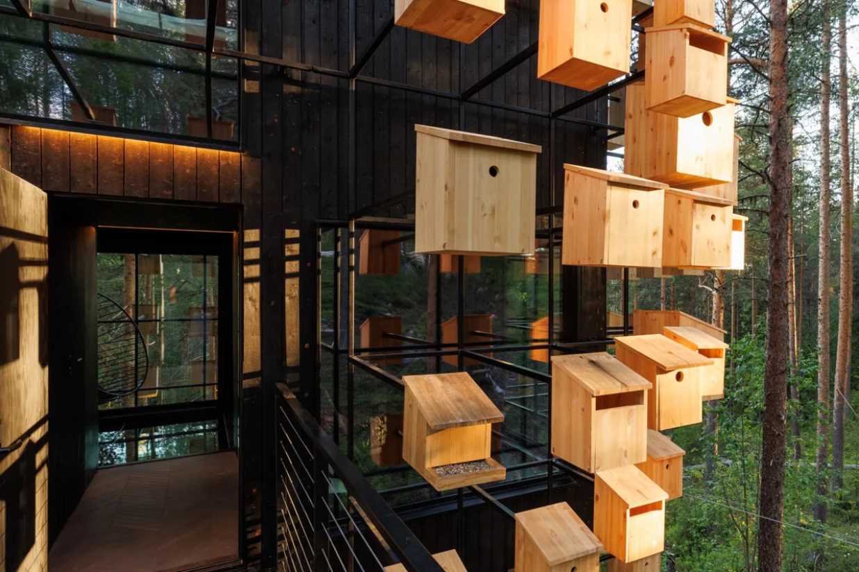 The Biosphere amplifies Treehotel's focus on sustainability and natural tourism, helping facilitate the conservation of the local bird population. With a façade containing 340 bird nests. It is accessed via a suspended bridge that slopes from the ground to the top of the trees. The interior of the 34m2 hotel room incorporates rich dark interiors and organic materials inspired by the surrounding landscape, which further serve to reinforce the visitors' view outwards, and to focus on the natural beauty of the surroundings. The room has a double bed, tea and coffee making facilities, complimentary WIFI internet connection, bathroom (incineration WC, washbasin, sauna and shower), panoramic views of the forest and a roof terrace.