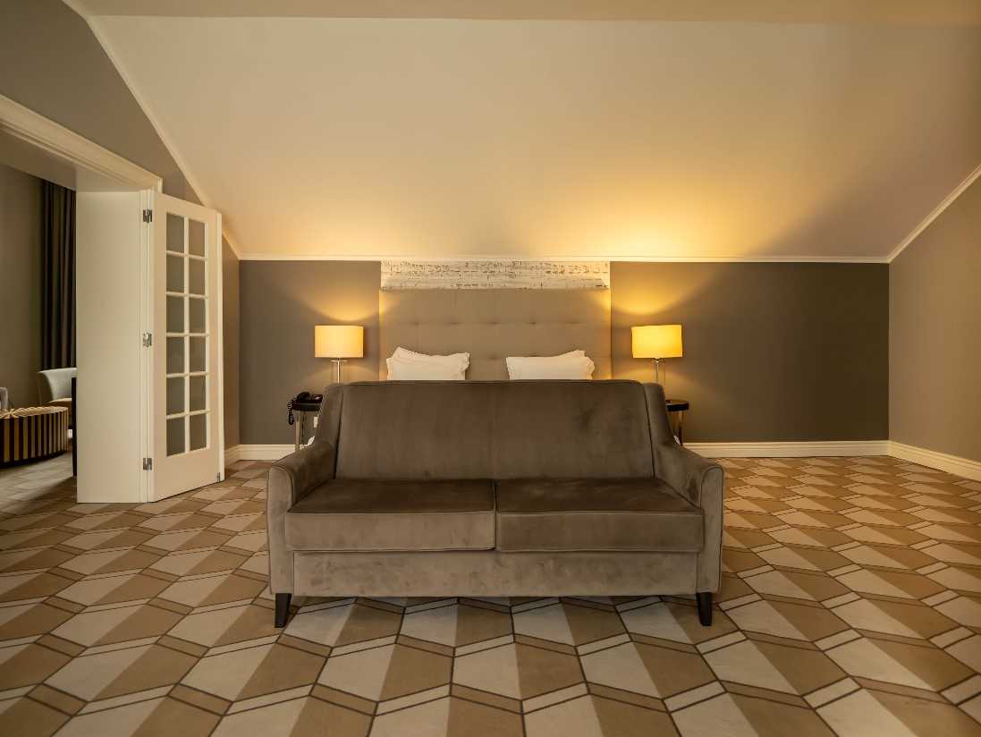 Suite Charamba, located in the original Conservatory wing, with air-conditioning, king size bed, bathroom (bath and shower), hairdryer, living room area with sofa bed suitable for two children (2-11yrs), telephone, cable TV, complimentary WiFi, minibar, safe deposit box and an internal view of the pool.